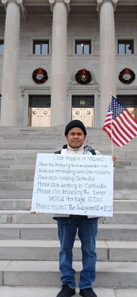 I have written this up not as a request for any more donations(although we need wells more than ever), but simply as an informational piece to let you know that the conflict has affected our library and families in Cambodia. The wells that we have donated over the years are an instrumental part of keeping our families and new refugees alive. Saron just sent us this picture showing his message in Little Rock, Arkansas, last week. Let us join in supporting his love for his countrymen. Karen and Ben